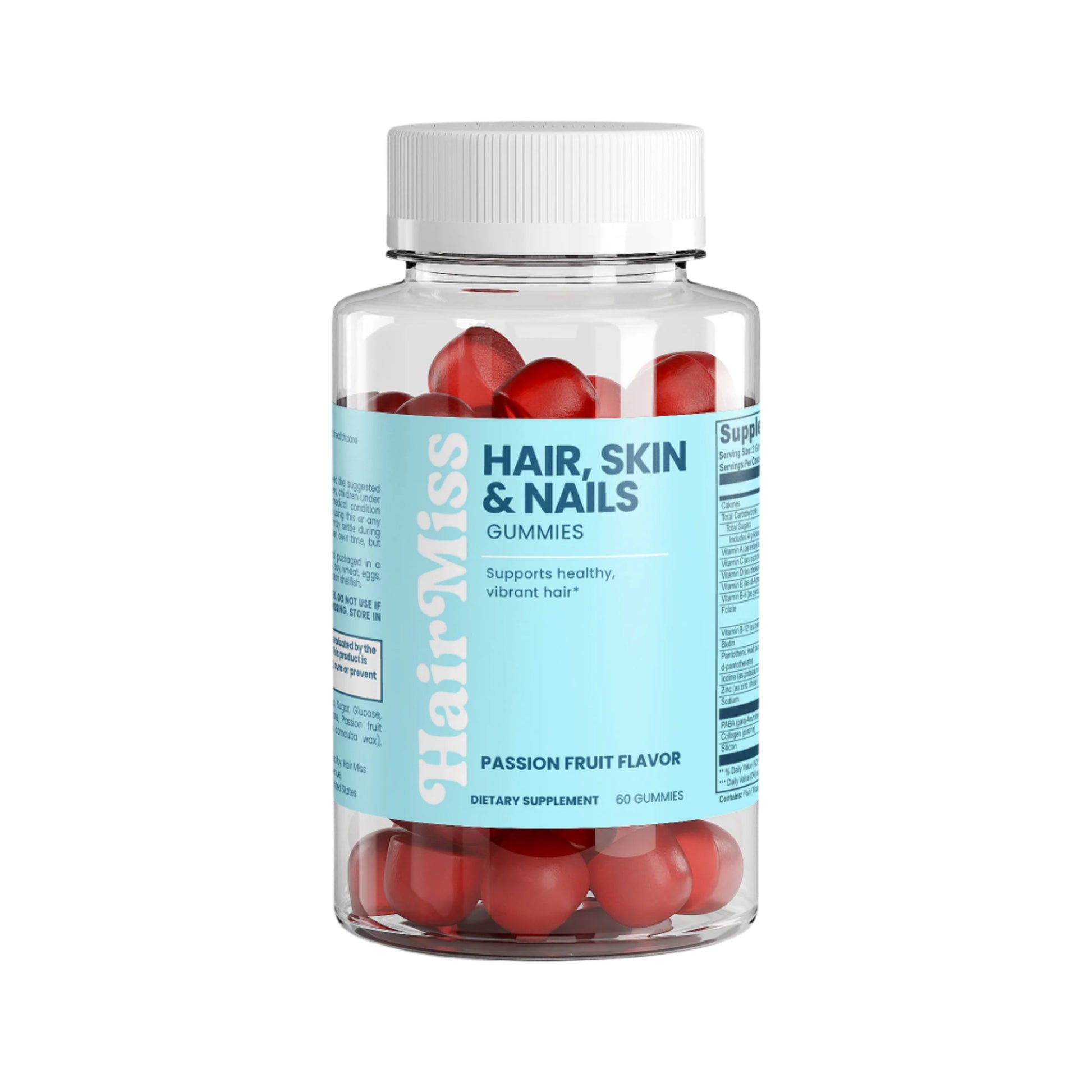 Ingredients: Vitamin A (as retinyl acetate), Vitamin C (as ascorbic acid), Vitamin D (as cholecalciferol), Vitamin E (as dl-Alpha tocopheryl acetate), Vitamin B-6 (as pyridoxine HCI), Folate, Vitamin B-12 (as cyanocobalamin), Biotin, Pantothenic Acid (as calcium d-pantothenate), Iodine (as potassium iodide), Zinc (as zinc citrate), PABA (para-Aminobenzoic Acid), Collagen (piscine), Silicon, Glucose syrup, Sugar, Glucose, Pectin, Citric acid, Sodium citrate, Passion fruit flavor, Vegetable oil (contains carnauba wax), Purple carrot juice concentrate.